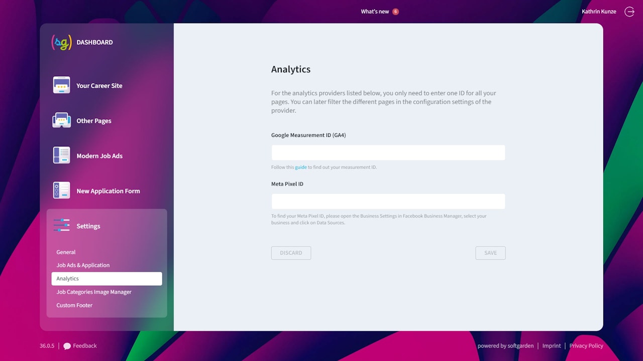For the analytics providers listed below, you only need to enter an ID. This ID will automatically be applied to all landing pages, job advertisements, and application forms. You can later filter the various landing pages in the provider's configuration settings.