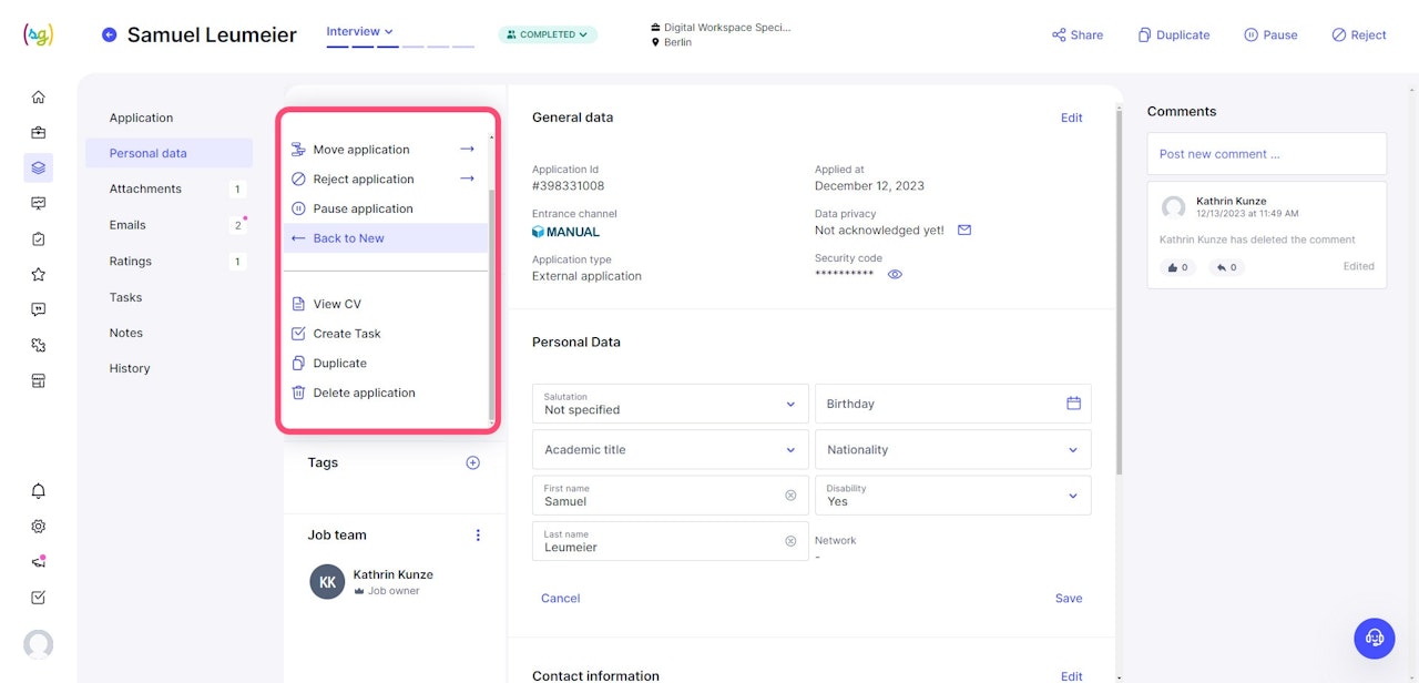 After an applicant has been rejected, the link “Delete Application” appears in the applicant's folder menu. The statistical data remains present but is anonymized.