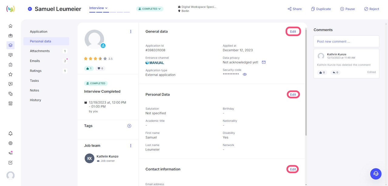To modify or complete applicant data retrospectively, use the 'Edit' button. In edit mode, you have access and can edit the contents.
