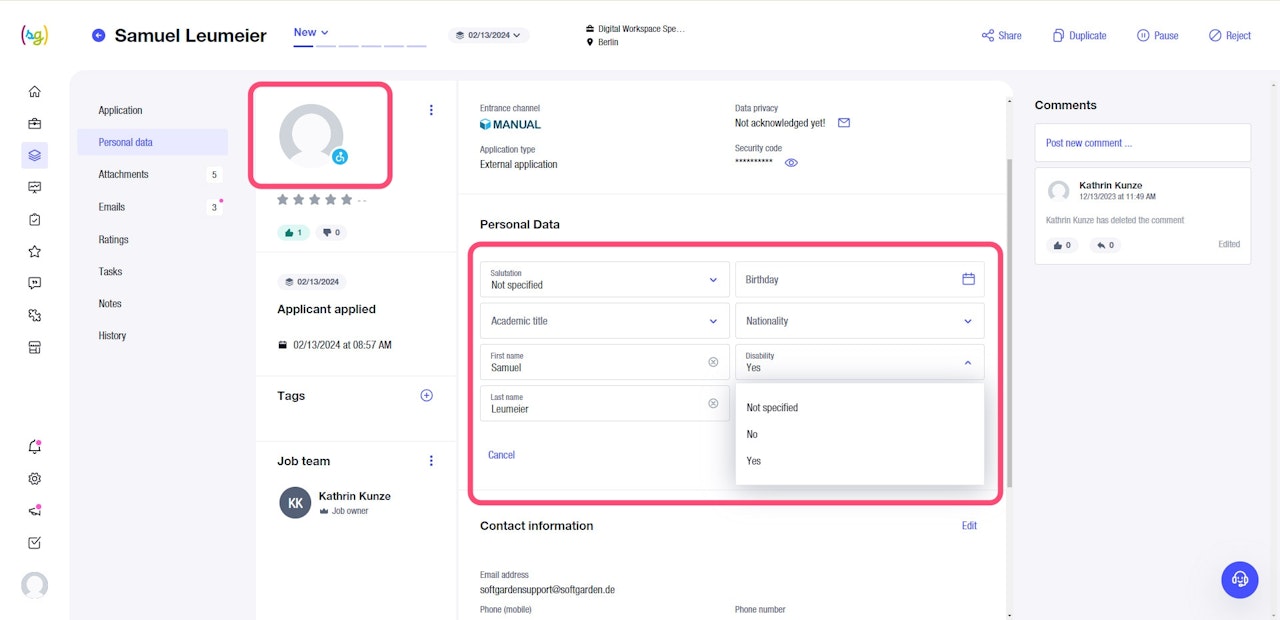 A disability can be indicated using the editing function in the applicant's profile under the 'Personal Data' section in the Disability field.