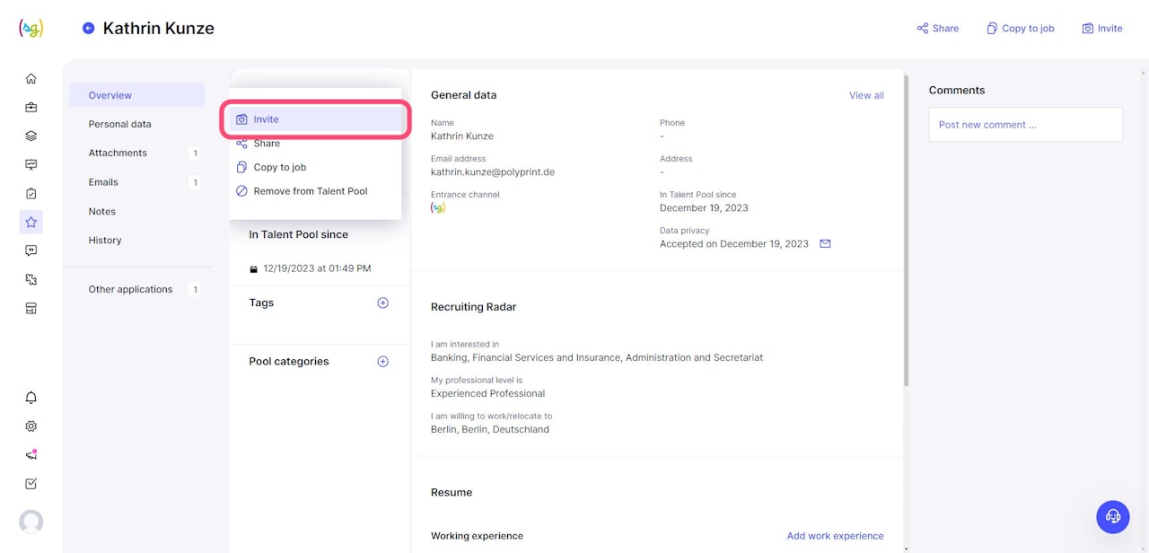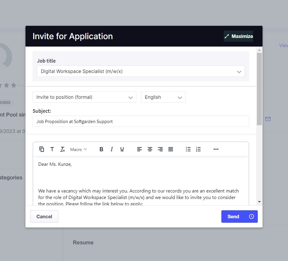 Subsequently, a new window opens, listing all your jobs in a dropdown menu. You can select the desired position before sending the invitation via email.