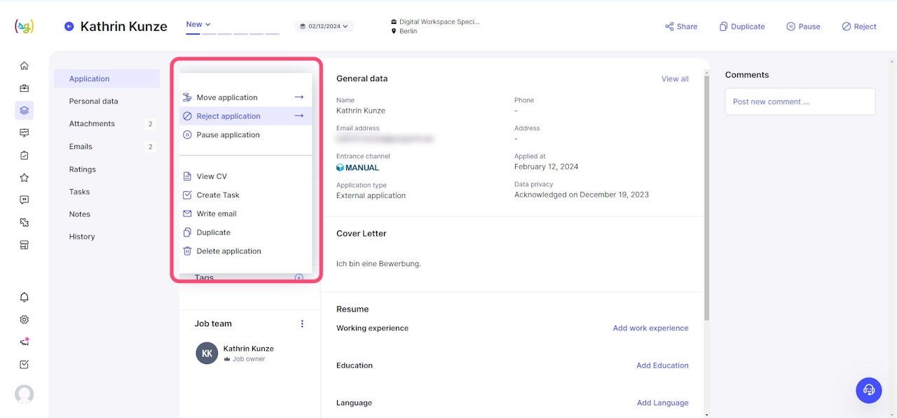 Applicants that you initially or no longer want to consider in the application process can be removed in three ways; with a rejection, by pausing, or marking for rejection.