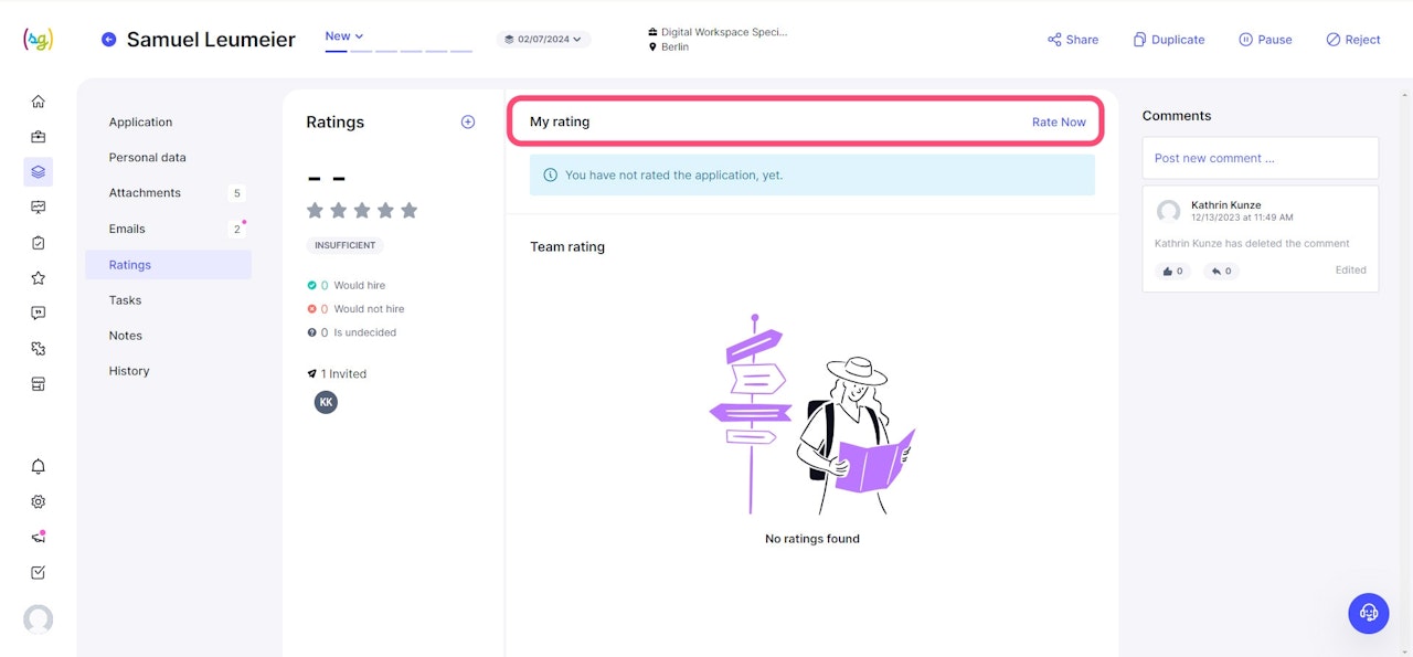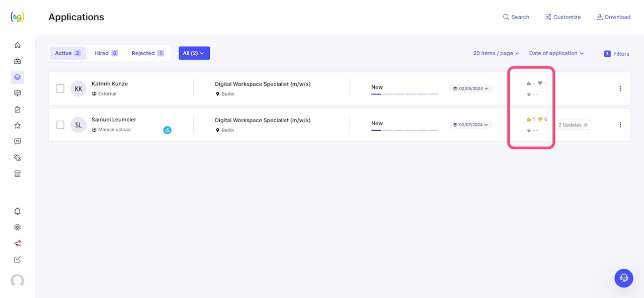 You can see the calculated average rating for each candidate individually in their respective profile and for comparison in the applicant list.
