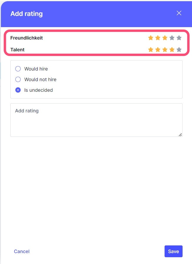 If evaluation criteria were defined as part of the job posting, these criteria can be rated for each application.