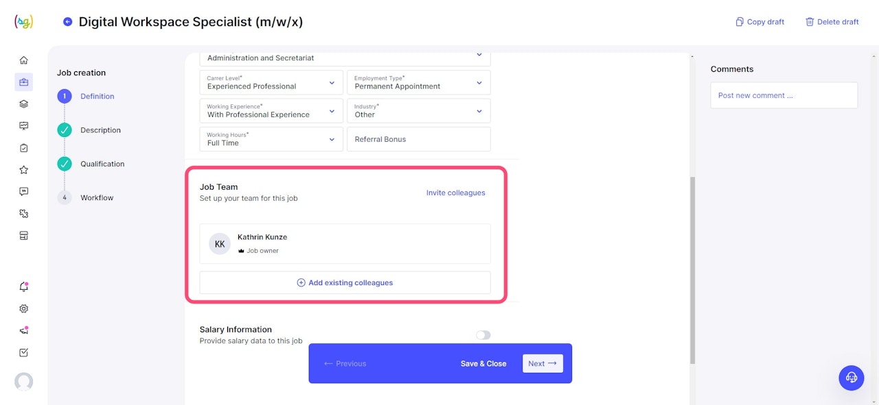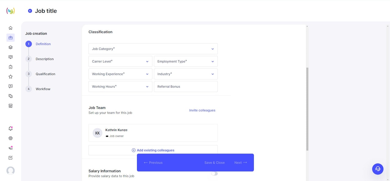 In step one, you define the basic information for your new position, as well as the employees belonging to the recruiting team.