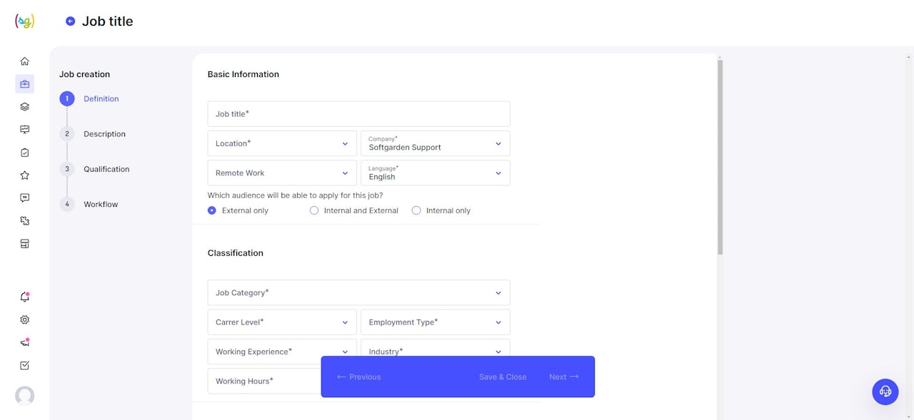 The Job Definition section consists of a catalog system. The catalog entries defaultly provided are tailored for optimal visibility with the most common job boards, and applicants can search for the appropriate job advertisement using filters during job search.