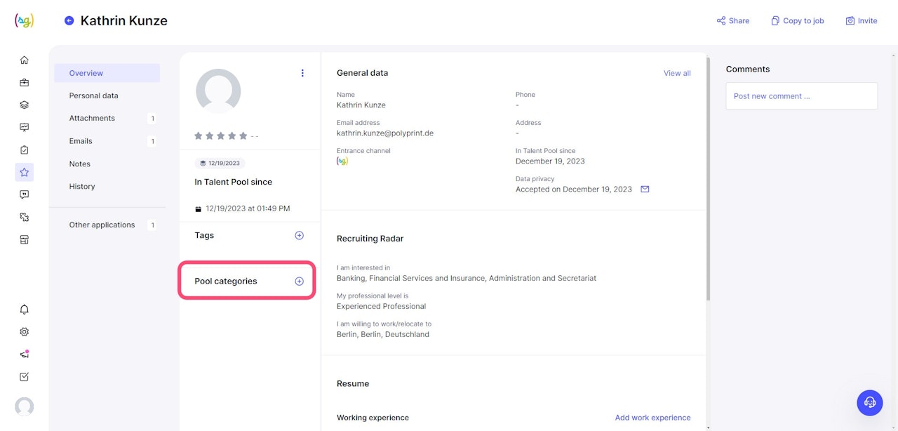 On the left side of the applicant's profile, you will find the 'Pool Categories' field. This way, talents can also be moved to the created categories.