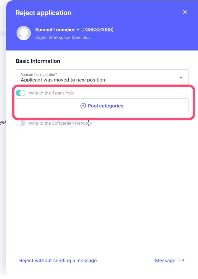 When rejecting an applicant, you also have the option to assign a Talent Pool category by simultaneously sending the invitation to the pool, including the invitation link, in the rejection email.