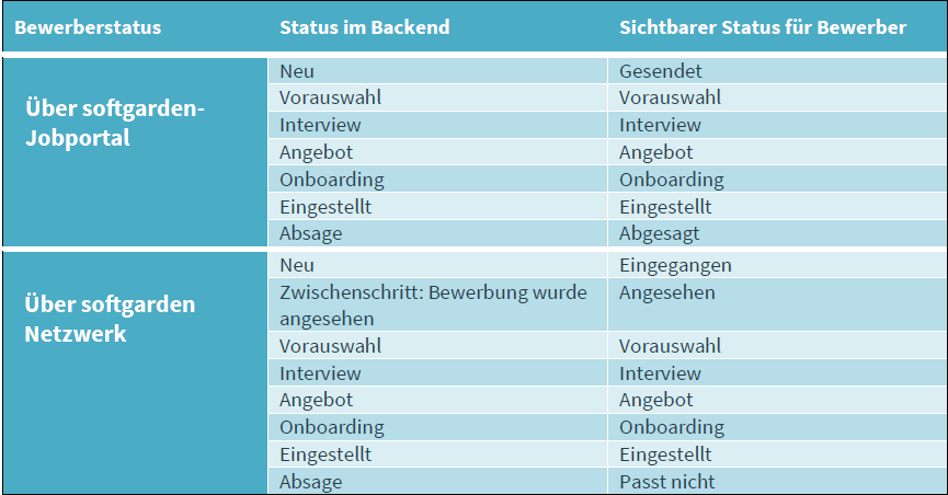 If custom workflows are created and in use in the system, the utilized workflow with its named workflow steps will be displayed. The table below illustrates the standard workflow as an example. Additionally, it distinguishes the application entry based on whether it occurred through your softgarden Job Portal or the softgarden Network.